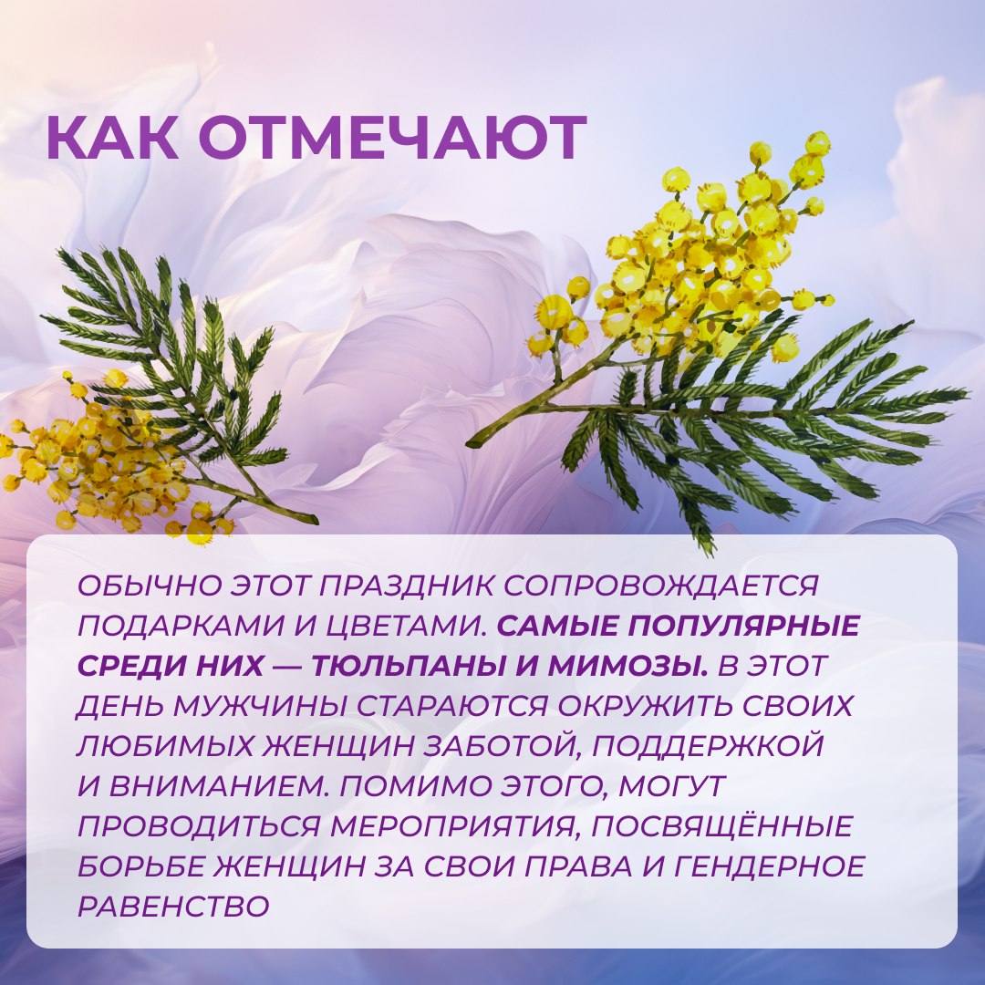 В преддверии Международного женского дня предлагаем взглянуть на историю и традиции этого замечательного праздника. Узнайте, как появилось 8 марта, кого принято поздравлять и как этот день отмечают в разных уголках мира