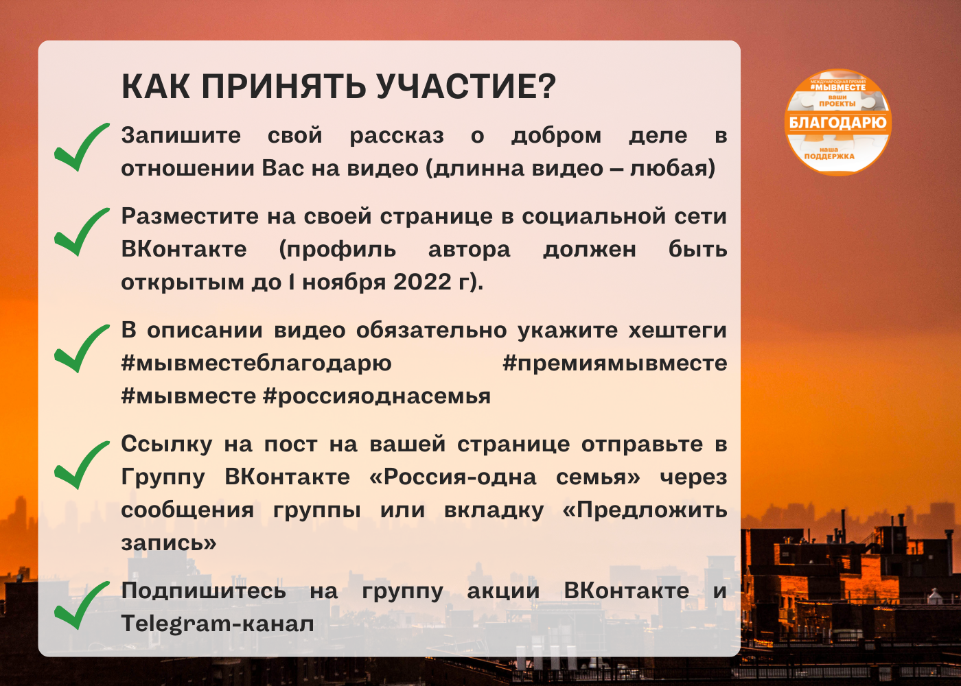 - Разместите на своей странице в социальной сети ВКонтакте (профиль автора должен быть открытым до 1 ноября 2022 г). В описании видео обязательно укажите хештеги #мывместеблагодарю #премиямывместе #мывместе #россияоднасемья