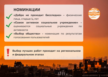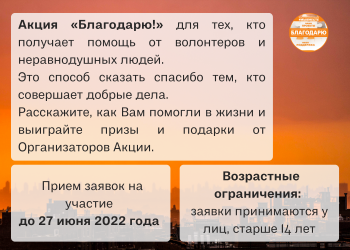 Акция «Благодарю!» для тех, кто получает помощь от волонтеров и неравнодушных людей. Это способ сказать спасибо тем, кто совершает добрые дела. Расскажите, как Вам помогли в жизни и выиграйте призы и подарки от Организаторов Акции.