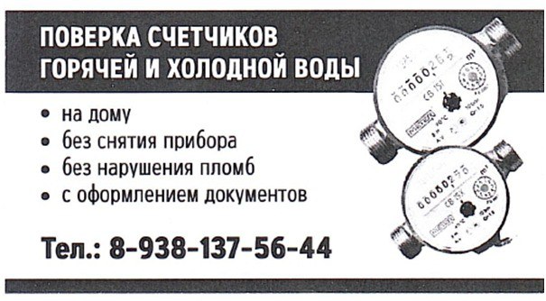 Метрологическая служба "МС - Ресурс" в лице представителя в г. Новочеркасске ИП Юдина Андрея Алексеевича. Запустила губернаторскую программу эстафету «Добрых дел» в рамках этого проводят бесплатно проверку счетчиков для обслуживающих Центра социального обслуживания населения г.Новочеркасска. Обращаться по номеру тел.: 8-938-137-56-44