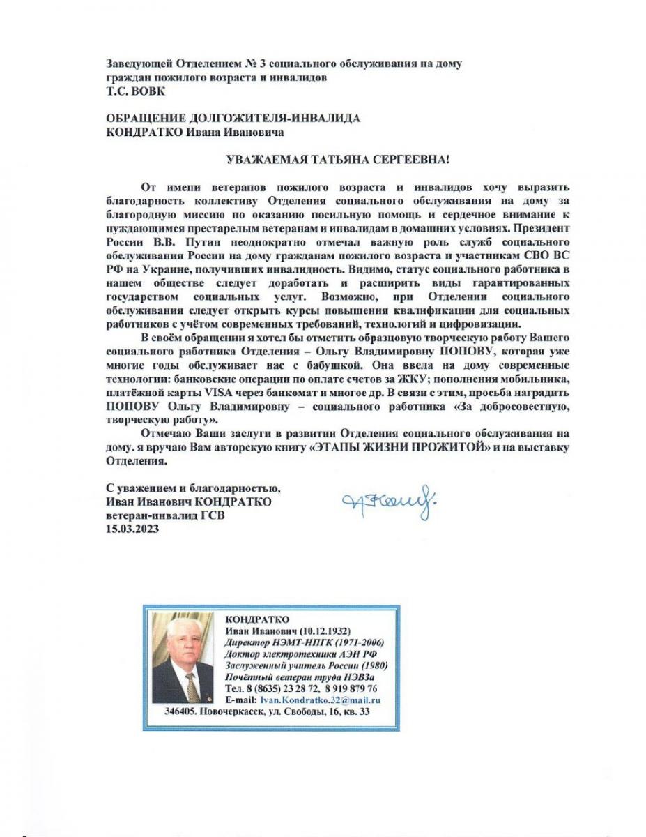Вовк Т.С. вручили благодарственное письмо и авторскую книгу Кондратко И.И. «Этапы жизни прожитой».