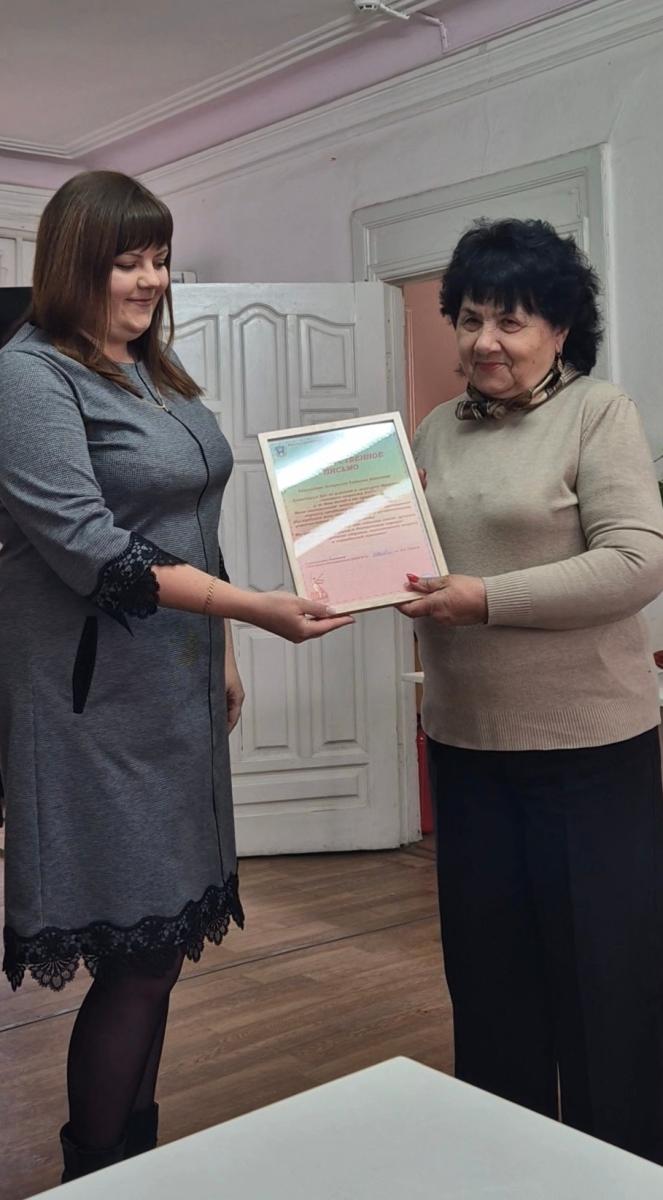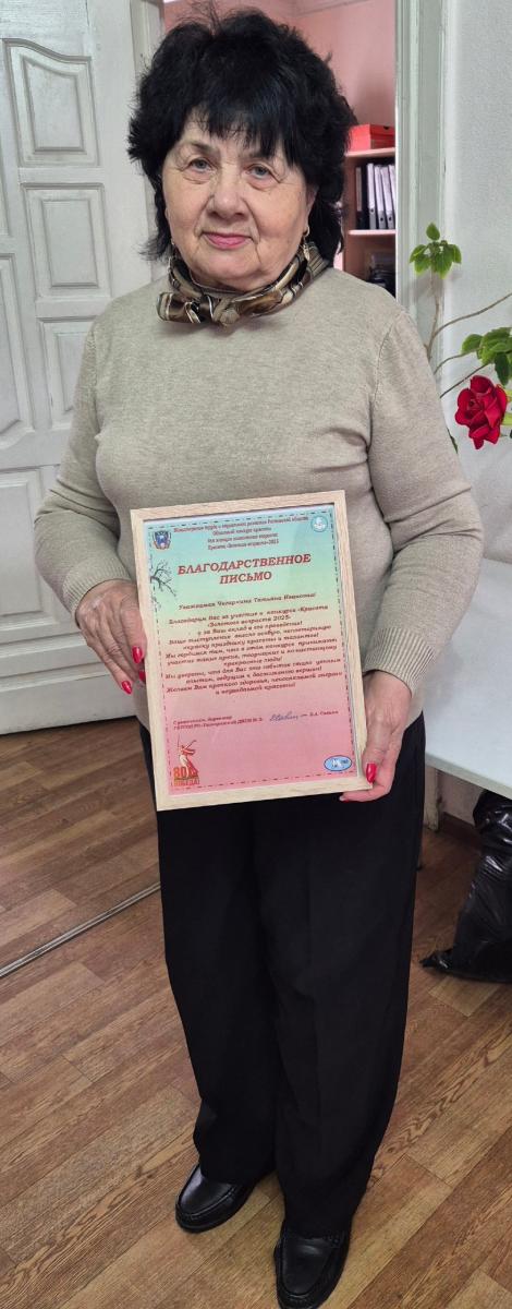 Слушательница Университета третьего возраста Центра социального обслуживания г. Новочеркасска Чигаркина Татьяна Ивановна награждена Благодарственным письмом за участие в конкурсе "Красота "Золотого возраста 2025", от организаторов конкурса.