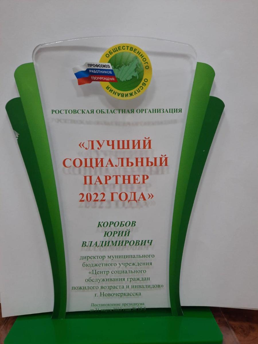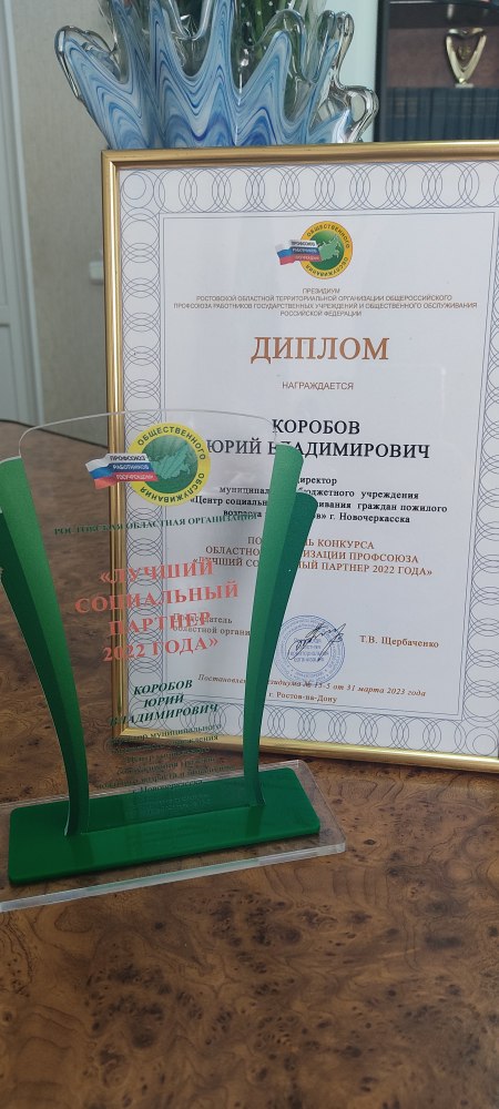 Директор муниципального бюджетного учреждения «Центр социального обслуживания граждан пожилого возраста и инвалидов» г. Новочеркасска Коробов Юрий Владимирович был награжден как победитель конкурса областной организации профсоюза «Лучший социальный партнер 2022 года»