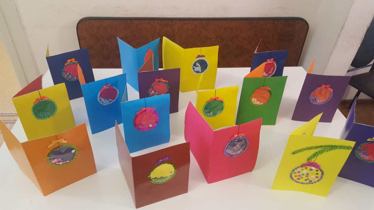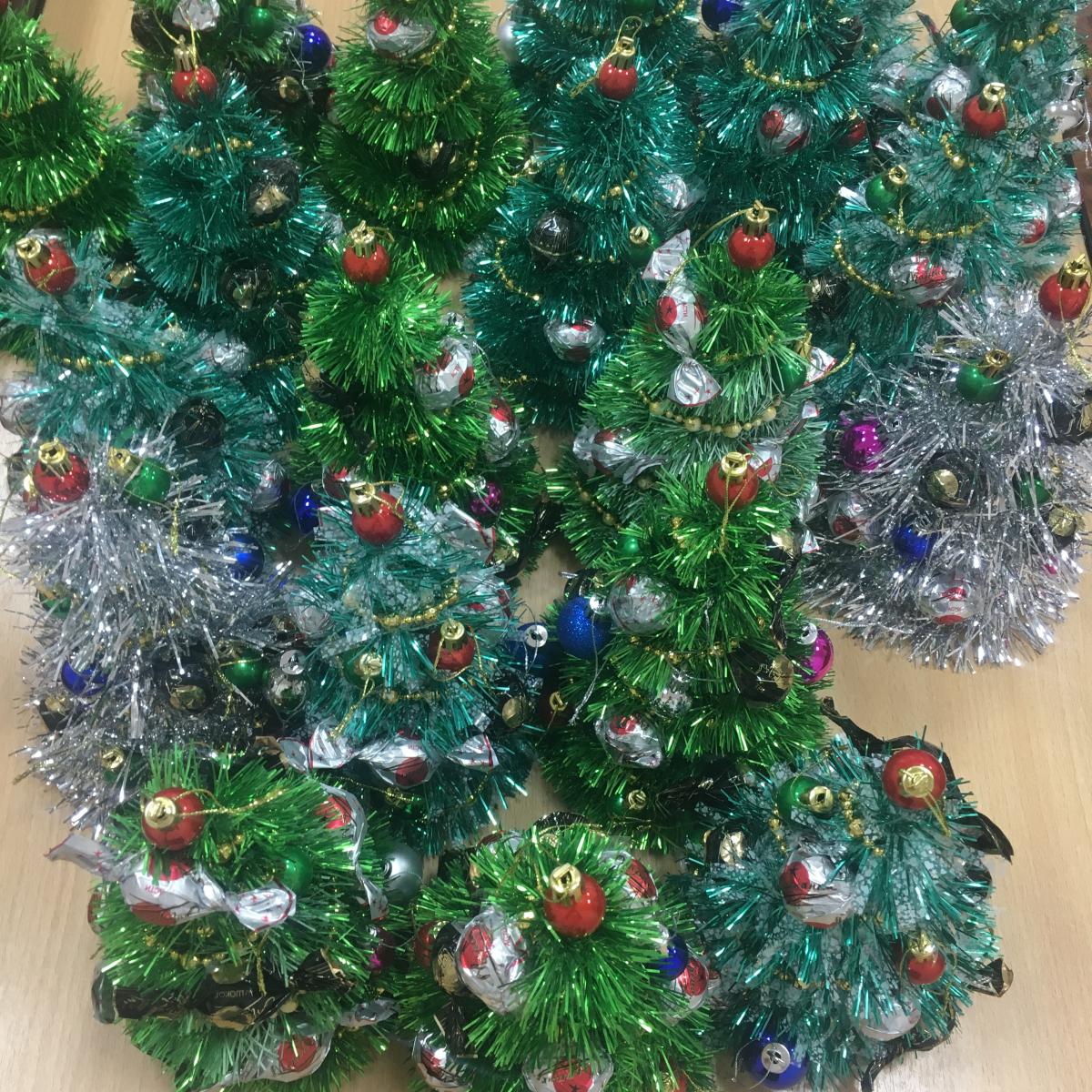 Всего было изготовлено 20 подарков (декоративная елка, украшенная шарами, бусами и конфетами) и 20 открыток с объемным эффектом. Каждая открытка была подписана лично каждым серебряным волонтёром.